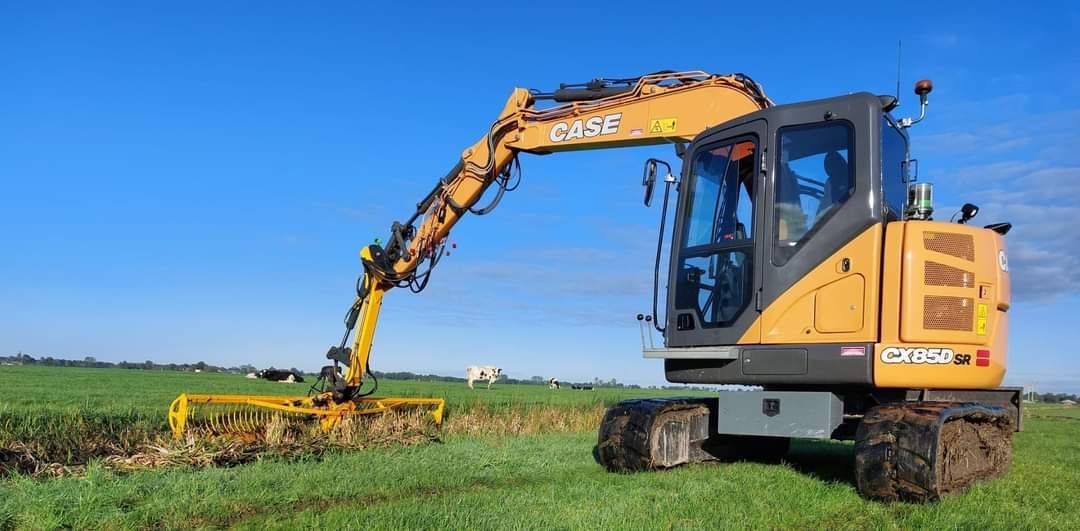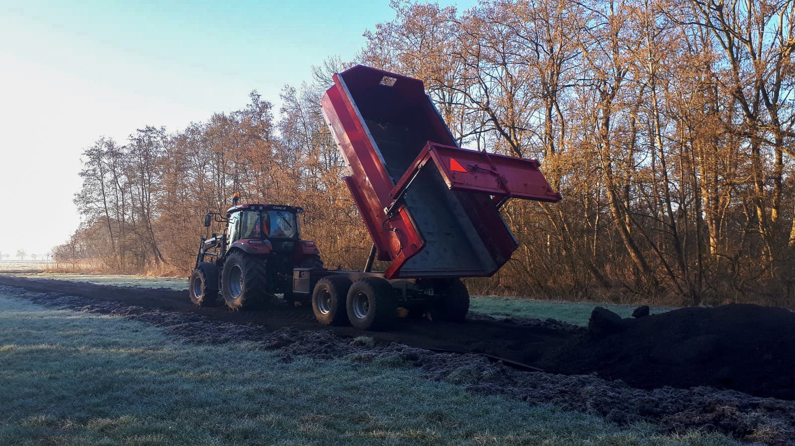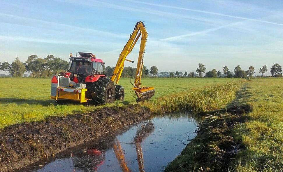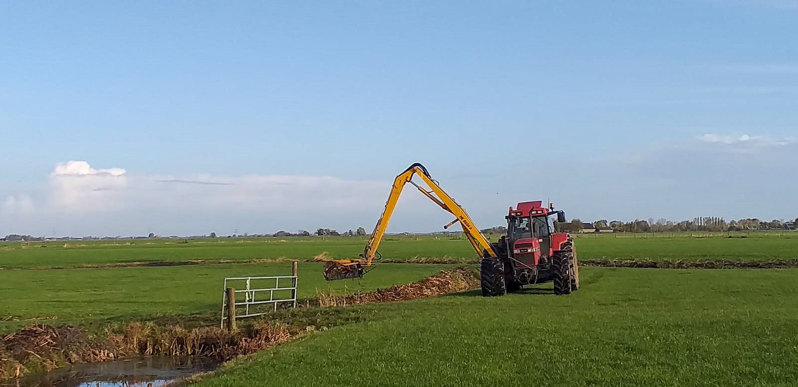 Hamming verzorgt het slootonderhoud met een 4.30m maaikorf bak kraan. Hierdoor kunnen we snel en efficiënt de klus klaren. De banden van tractor zijn extra breed zodat we de werkzaamheden ook in nat gebied (veen-/weidegebied) kunnen uitvoeren met zo min mogelijk spoorvorming.